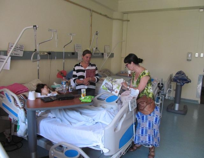 Dos veces a la semana, Paulina Jeldres, entretiene con divertidas fábulas y origami (figuras de papel de origen japonés) a pacientes hospitalizados, interactuando con ellos y haciendo más agradable la estancia en el hospital.