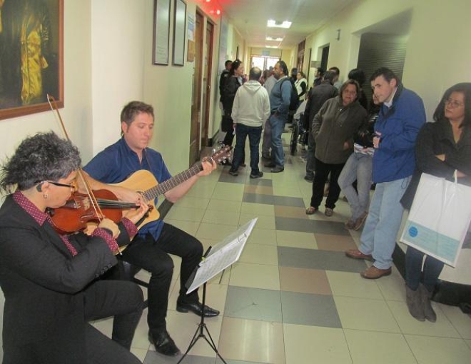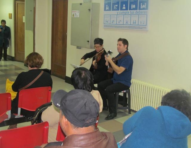 Por su parte, los músicos Hugo Cruz y Alicia Fischer deleitan con excelentes interpretaciones de violín y guitarra, a las personas que deben atenderse en urgencia o policlínicos, haciendo que la espera sea mucho más grata.